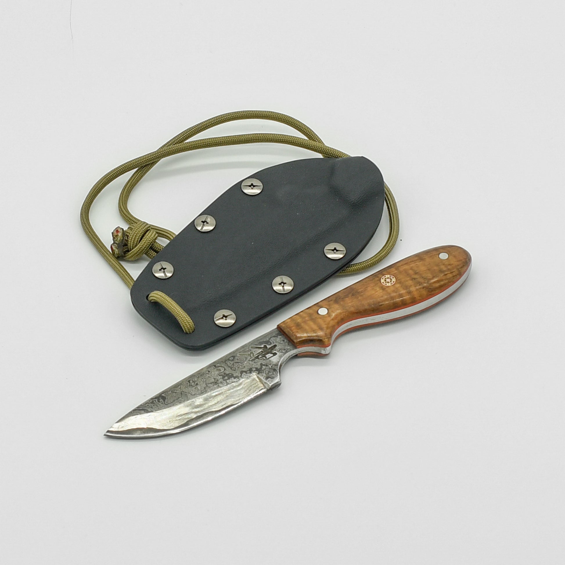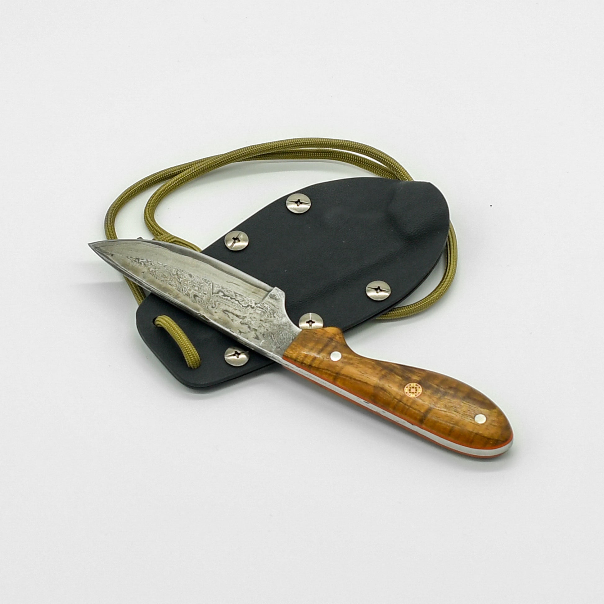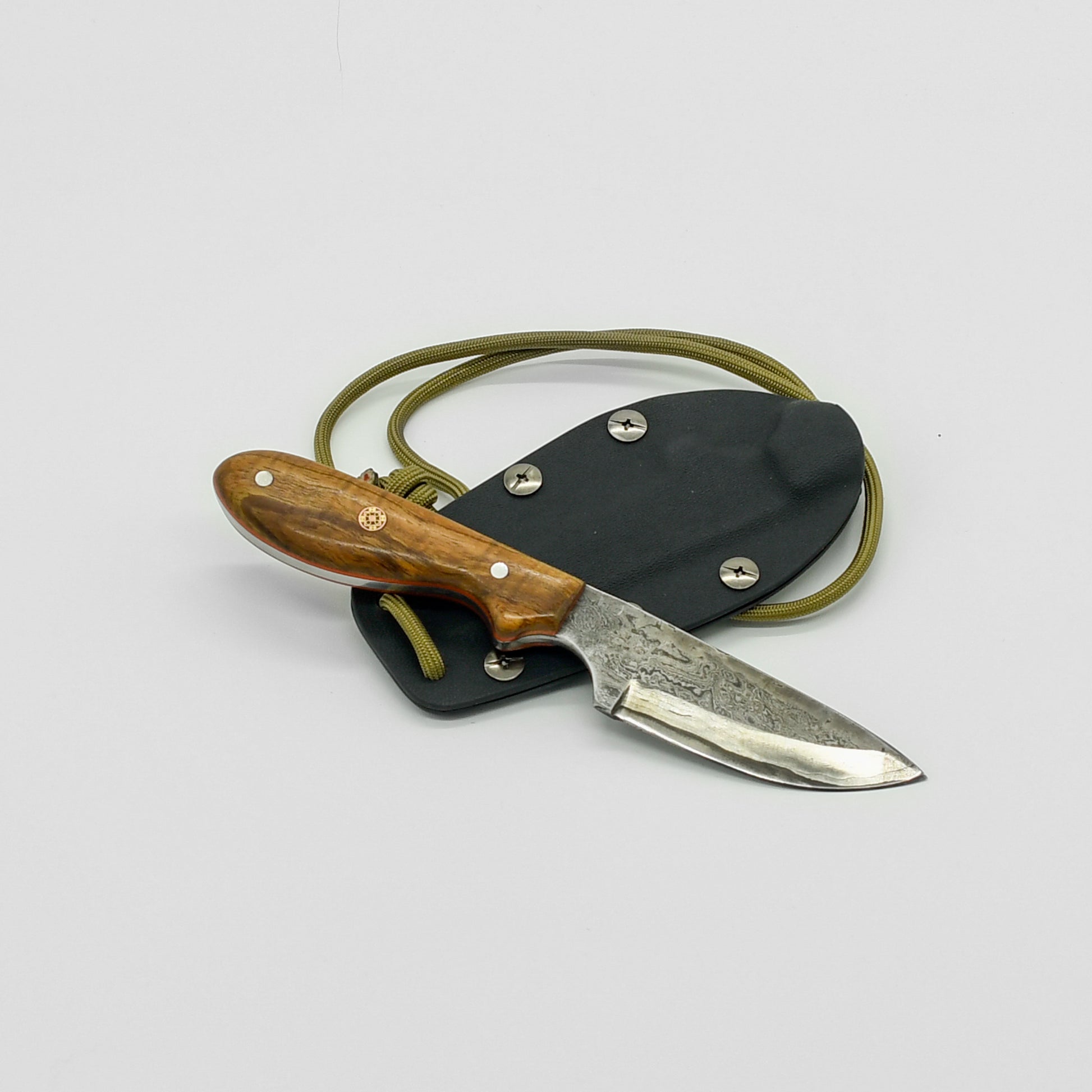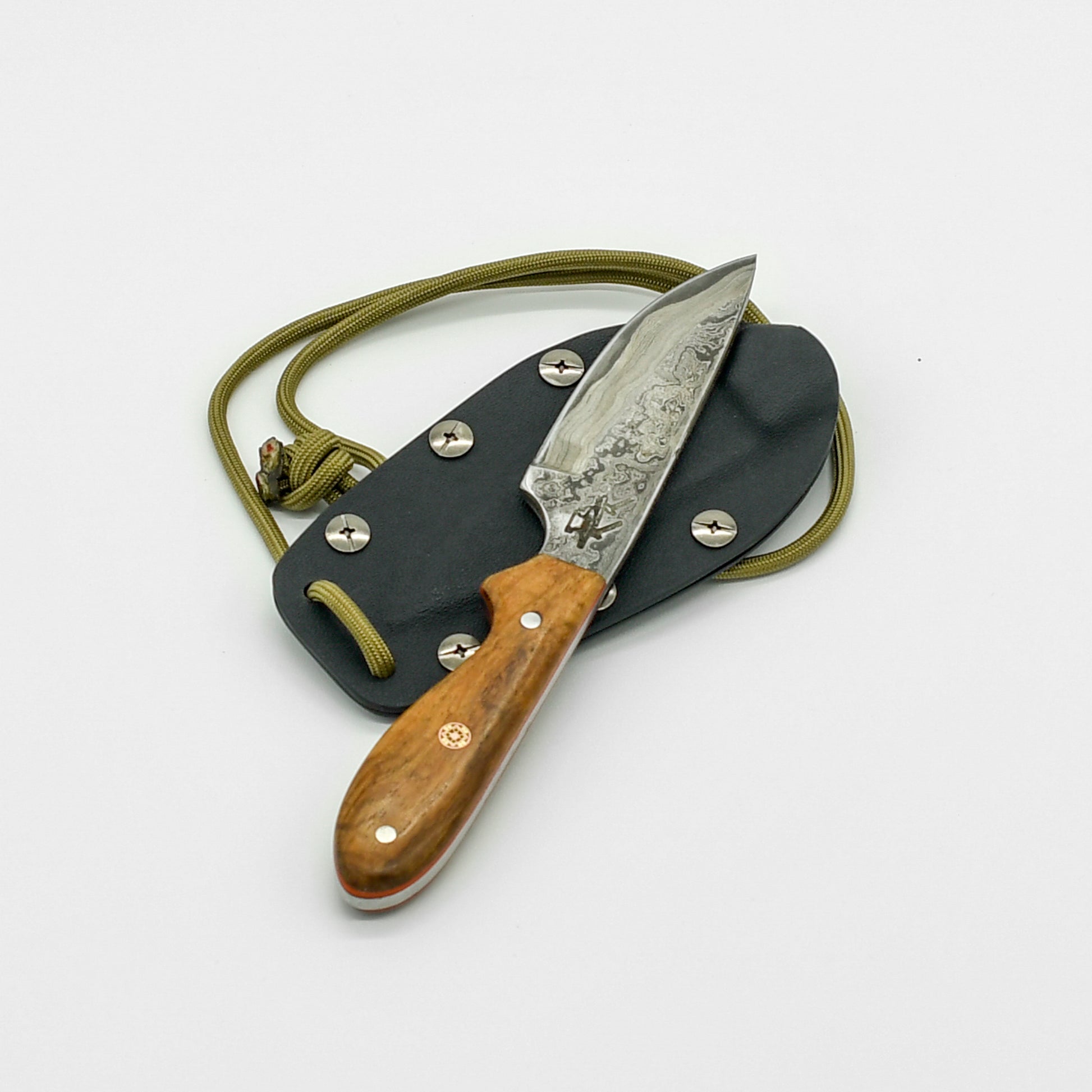 This compact and versatile neck knife, hand-forged by DBK, is the perfect everyday carry companion. The blade, crafted from tough O1 high carbon tool steel and clad in striking carbon steel Damascus, offers exceptional sharpness and edge retention. Its intricate Damascus pattern ensures that no two knives are exactly alike, making yours a unique work of art.