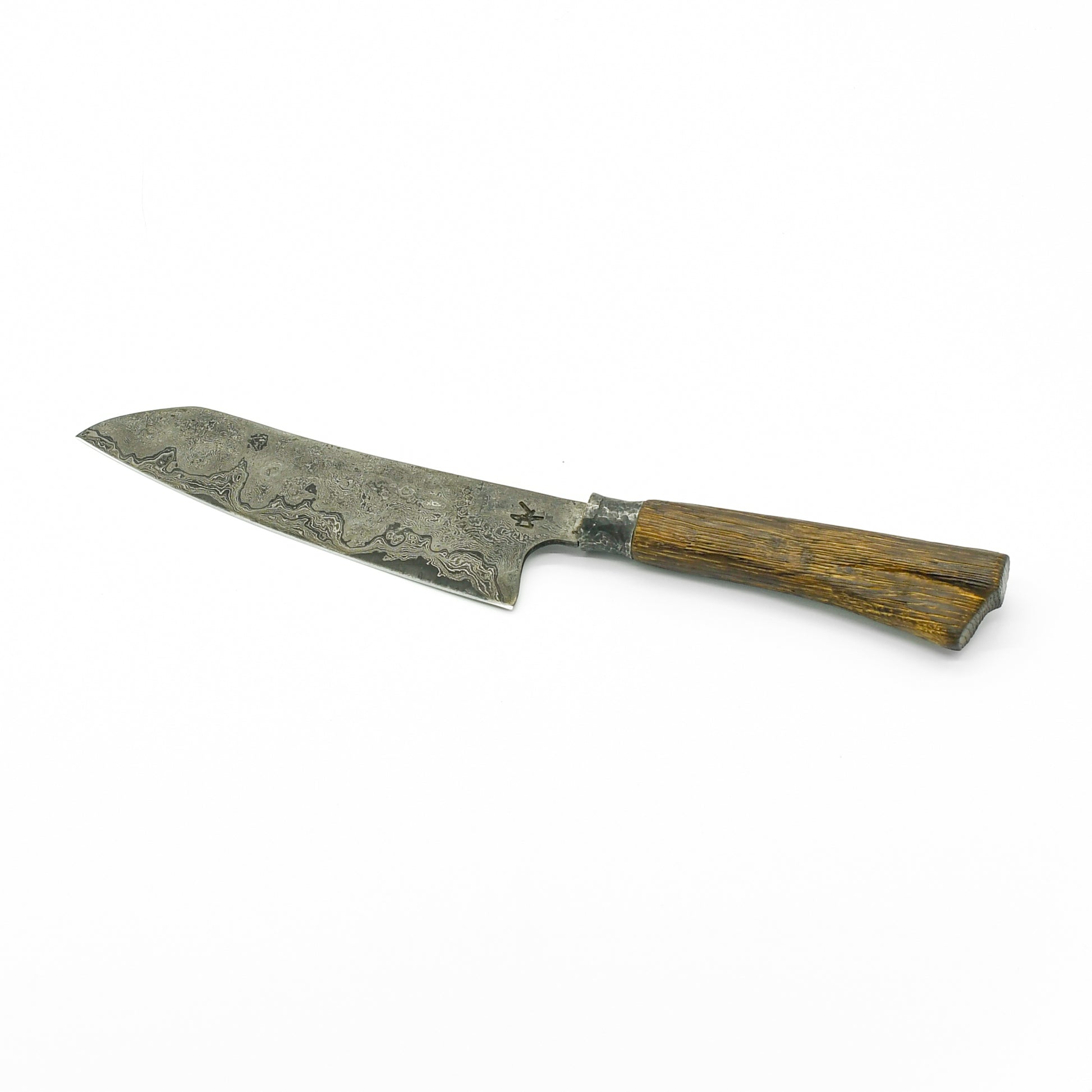 This exquisite Western Kitchen Knife, hand-forged by Dust Bowl Knives, seamlessly blends artistry and functionality. The blade, crafted from O1 high carbon tool steel and clad in high carbon Damascus steel, boasts exceptional durability and cutting prowess. Its intricate Damascus pattern adds a touch of elegance, making each knife a unique work of art.
